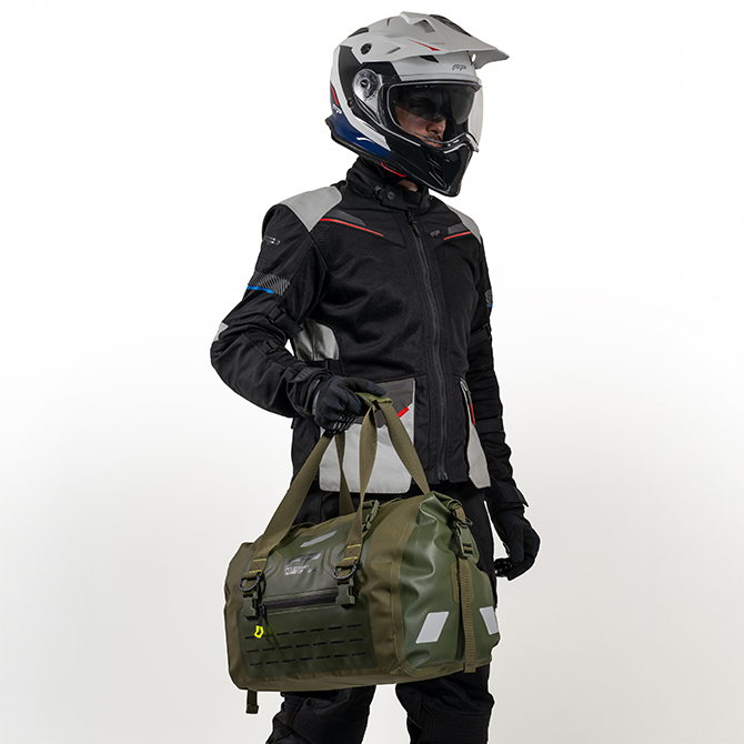El tono verde resalta su carácter aventurero y natural, ideal para quienes disfrutan de explorar nuevos caminos. Gracias a sus correas de sujeción ajustables, puedes fijarla fácilmente a la moto o usarla como maletín independiente. Una Dry Bag pensada para verdaderos exploradores.
