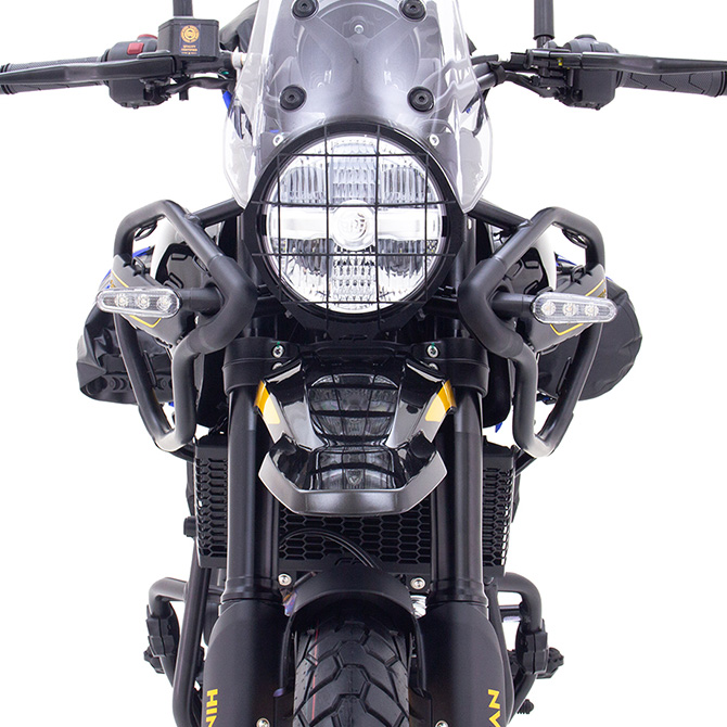No solo es funcional, también complementa el diseño de tu moto. Su estructura se adapta a la farola de forma precisa, destacando el frente con un estilo clásico, robusto y muy visible. Ya sea en ciudad o fuera de ella, este protector hace que tu Himalayan 450 luzca mejor y esté más segura.