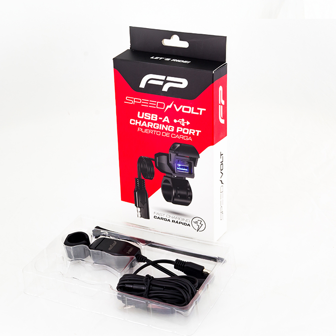 Mantén siempre cargados tus dispositivos mientras viajas en moto con el Cargador USB Speed Volt: resistente al agua y con carga rápida de 18W.