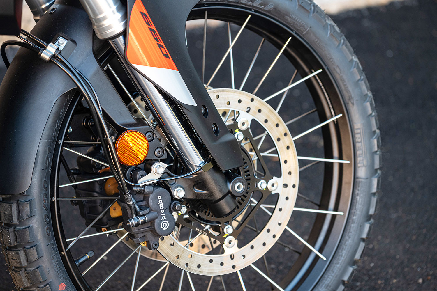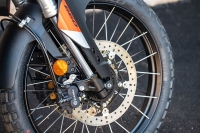 La suspensión Kayaba (KYB) totalmente ajustable mantiene todo ese peso en su lugar: una horquilla de 43mm en la parte delantera y un amortiguador progresivo en la parte trasera. Ambos extremos tienen 9,45 pulgadas de recorrido y (a diferencia de la Tuono) la Tuareg tiene resortes en ambas patas de la horquilla. El resultado es 9,5 pulgadas de distancia al suelo.