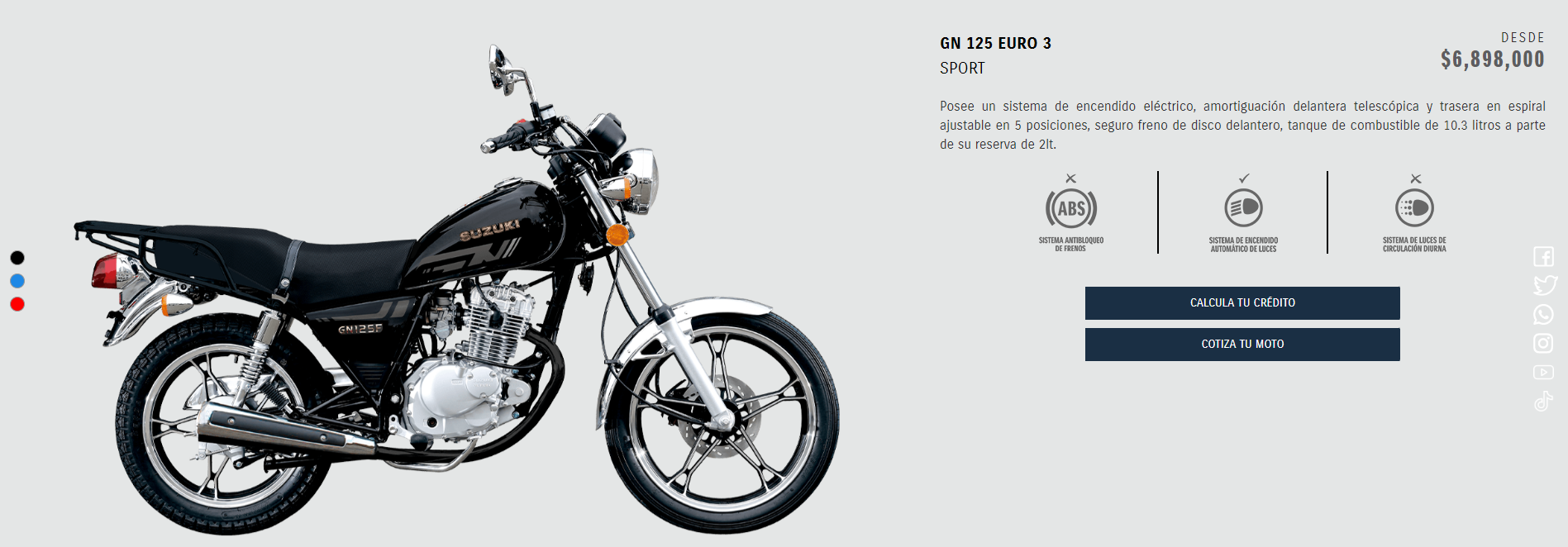 - Suzuki GN 125: Puede conseguirla nueva por un valor de 6’900.000 millones de pesos (sin papeles). Alcanza hasta 120 kilómetros por hora, tiene arranque automático y una capacidad de 2,7 galones en su tanque de combustible. Esta Suzuki tuvo 18.478 motos vendidas