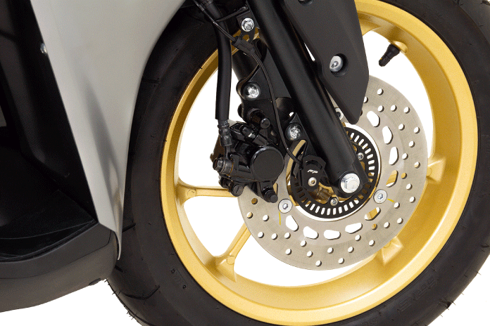 Disfruta de un gran rendimiento con un control superior. La Yamaha Aerox 155 cuenta con un freno de disco frontal de 230 mm con Sistema Antibloqueo de Frenos (ABS).