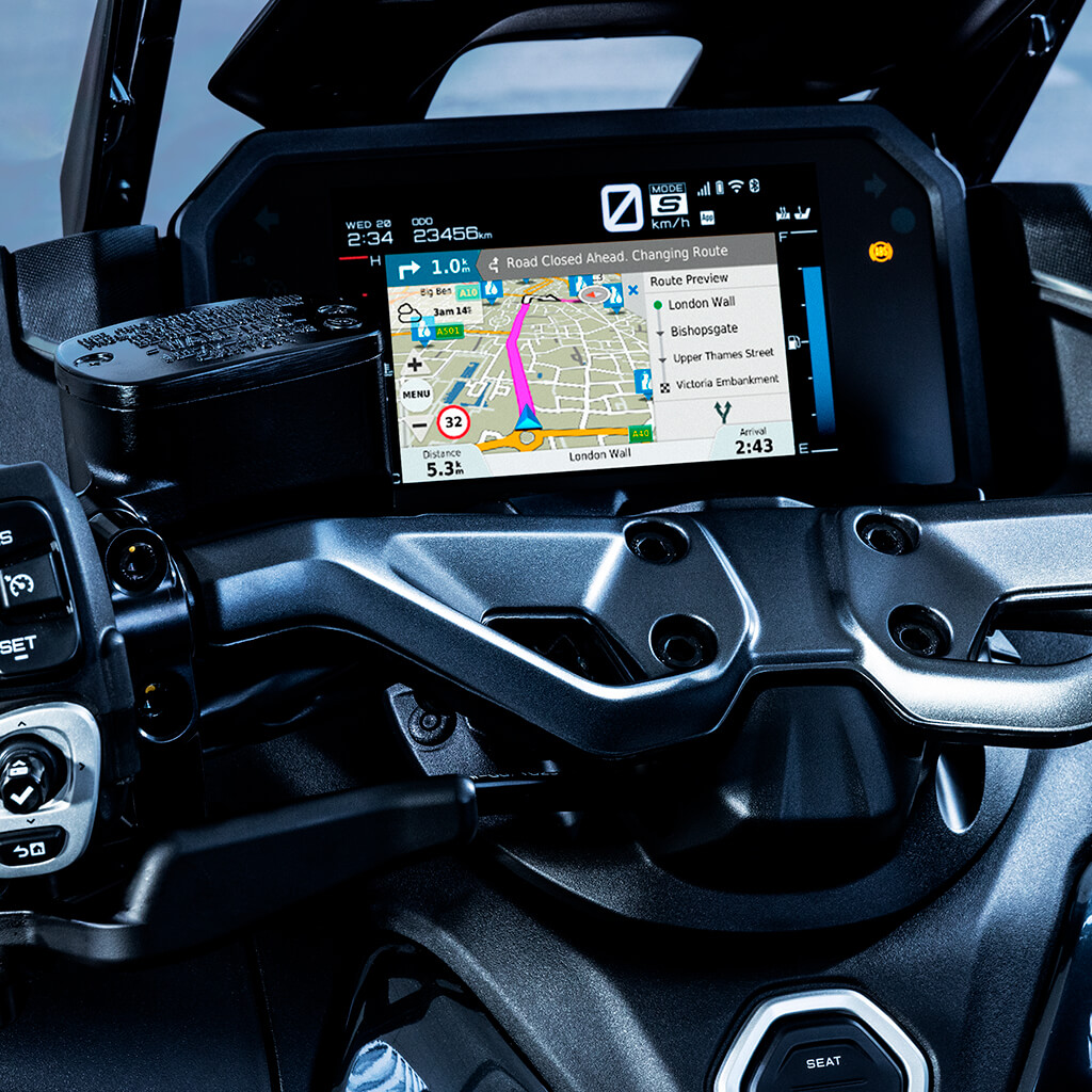 - Parabrisas con control eléctrico regulable desde los mandos de la moto