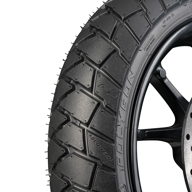 Llanta FP POLYGON: la opción ideal para motos doble propósito. Tracción en destapado, control en asfalto y excelente evacuación de agua en climas húmedos.