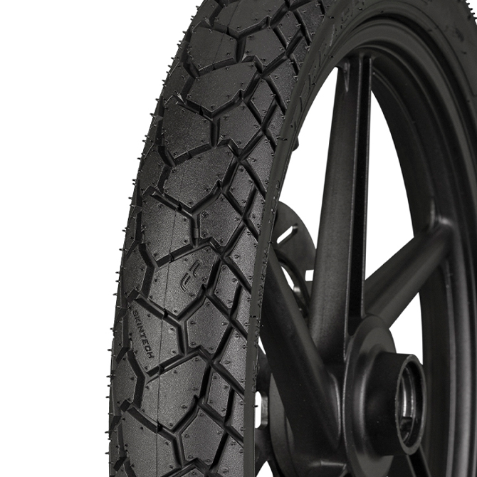 El compuesto de caucho balanceado ofrece desgaste uniforme y mayor vida útil, convirtiéndola en una opción ideal para motos de bajo cilindraje o trabajo urbano.
